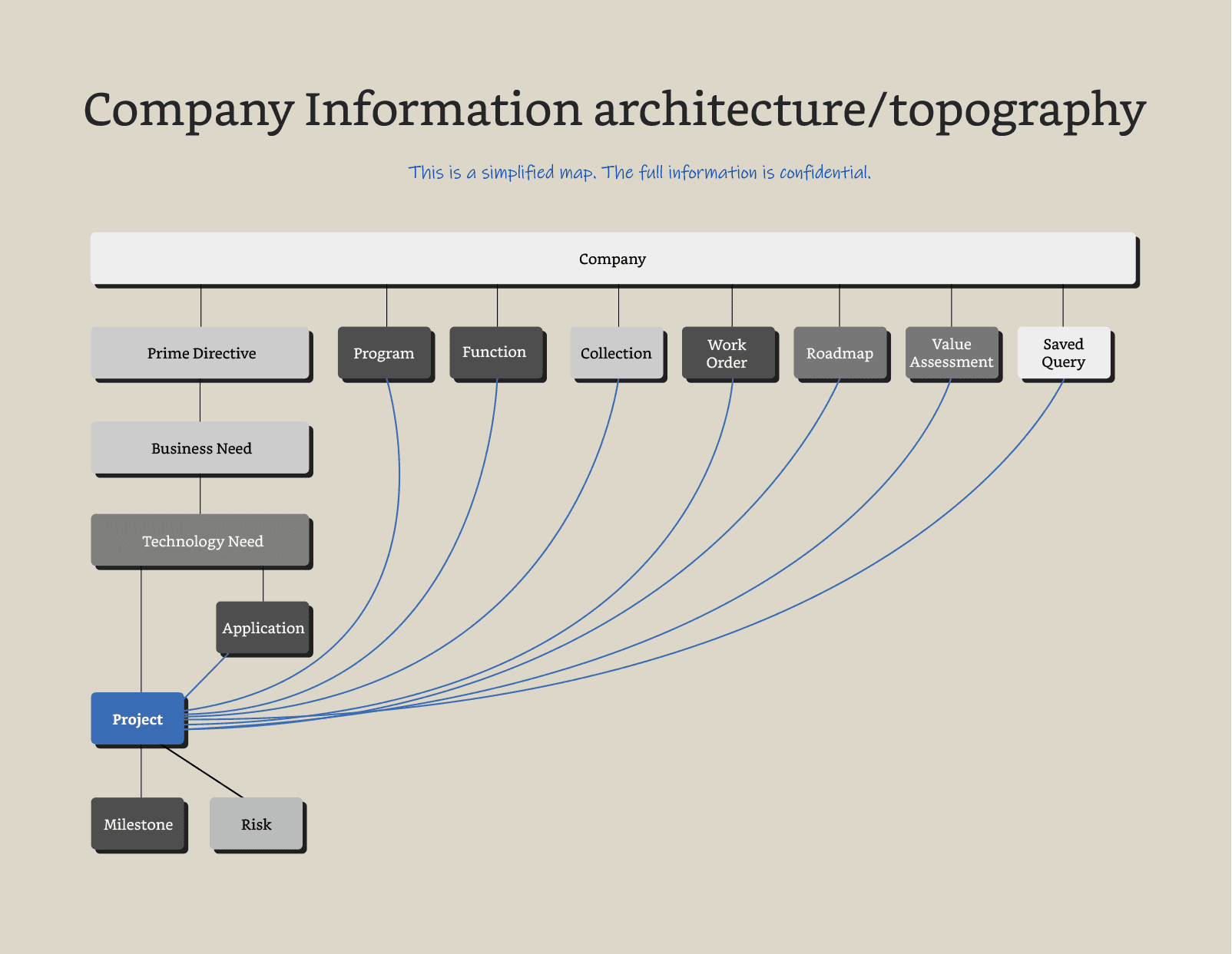 Our application's IA was based on a simplistic and incomplete understanding of the company's structures. We would have to capture all of the objects involved. If we missed any, our application could be under-designed, and end up useless and unused. The information topography was tangled and often contradictory, but we created a clearer picture for the company.