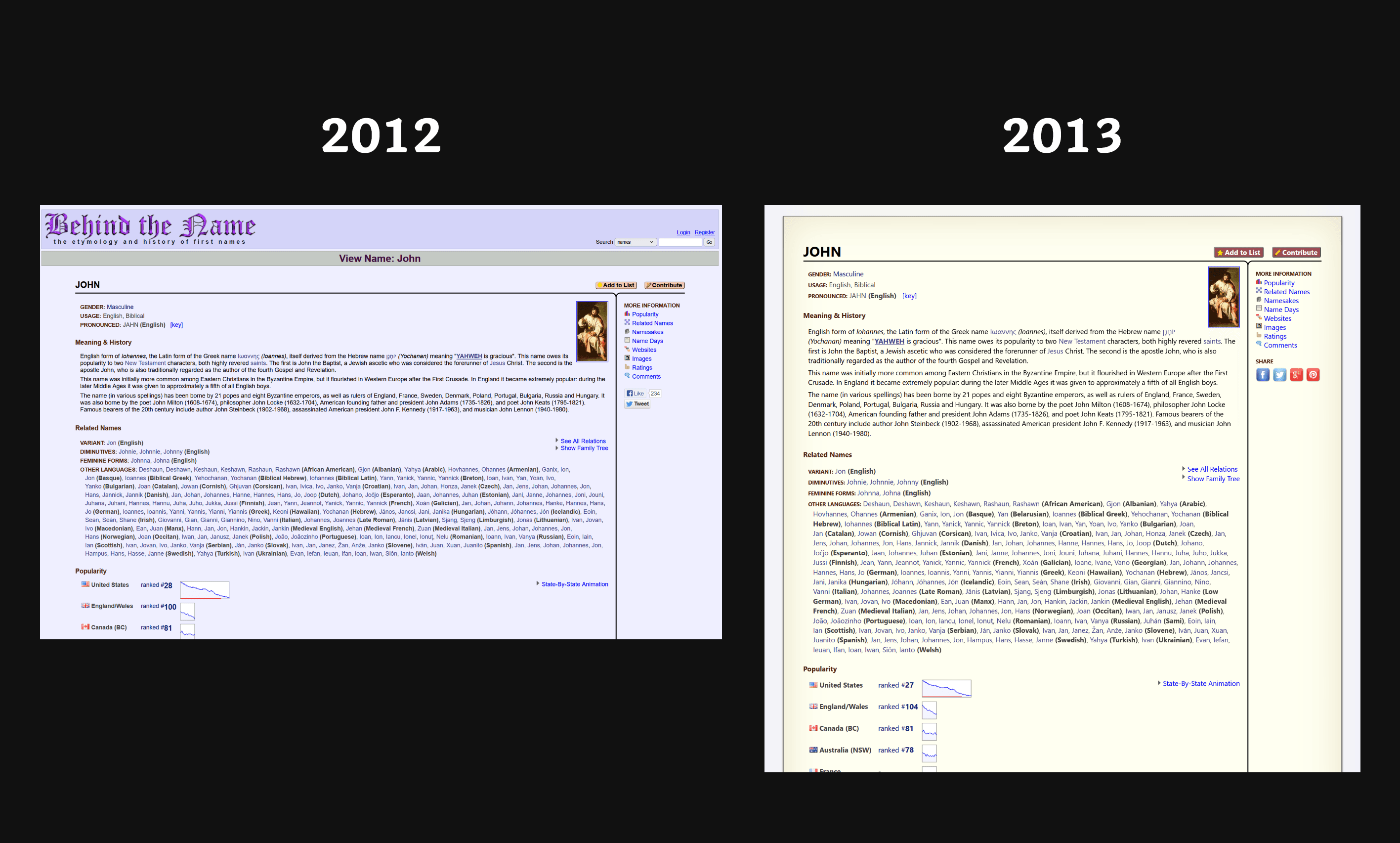 The initial redesign of Behind the Name included a mobile design which was not implemented initially. Years later, the lack of mobile support led to rapidly declining search traffic. This redesign, though somewhat dated at launch, nonetheless turned the decline into growth, and the site saw a 50% increase in traffic over three years.