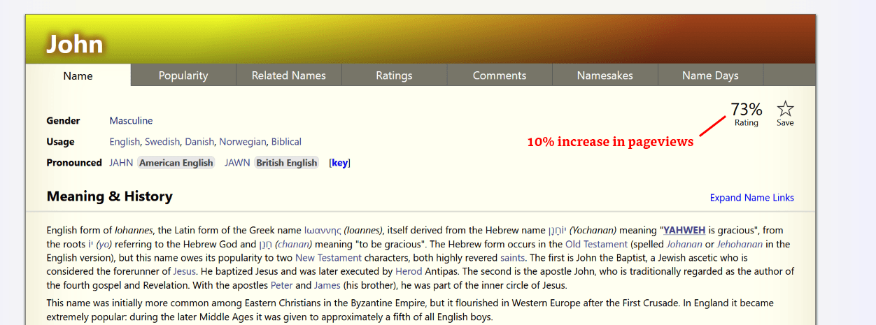 Previously if users wanted to see the overall rating of a name, they had to go to the Ratings page, and even then the score was not clearly displayed. This meant that users wanting to compare the ratings of multiple names had to click more for less information. The rating indicator allowed users to jump from name to name comparing ratings, which turned out to be a compelling activity, as that simple change led to a permanent 10% sitewide increase in page views.