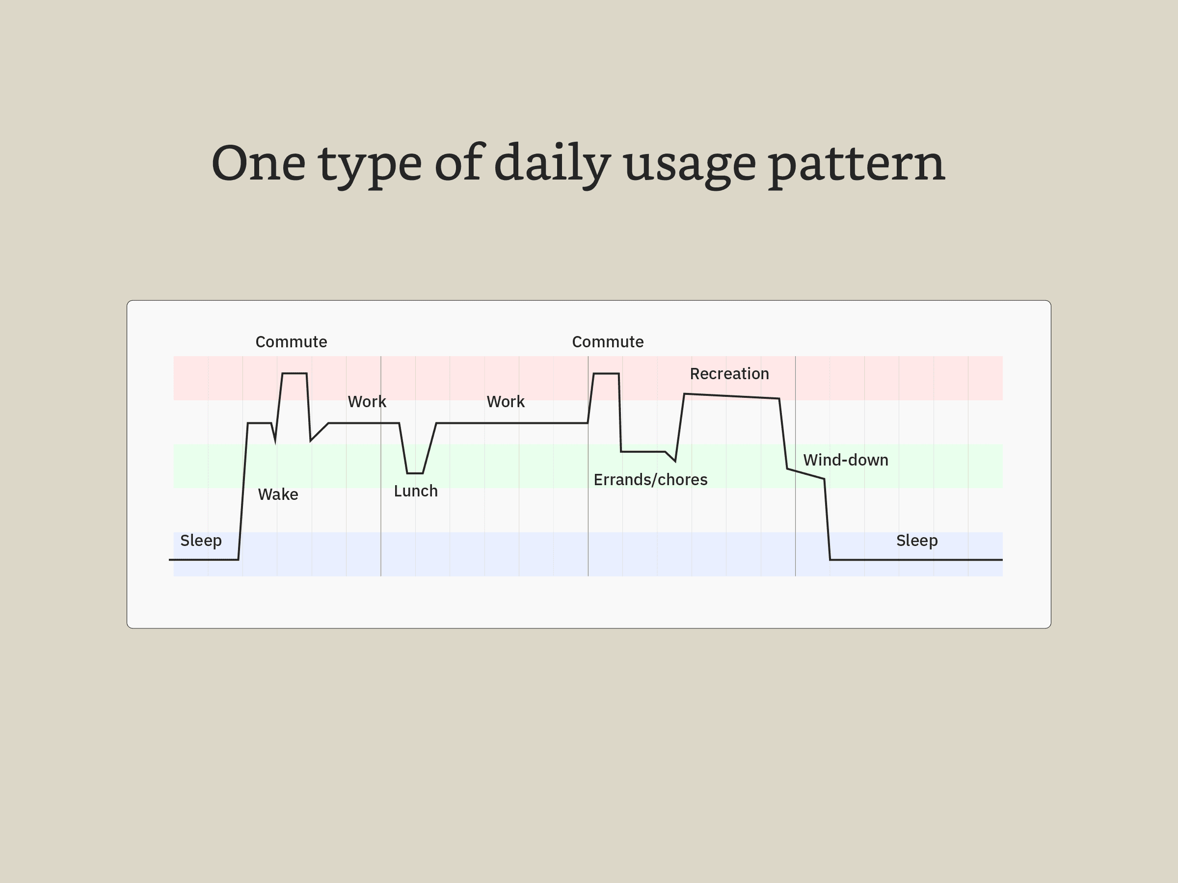 We then had to find a way to fit the usage of this app into a person's daily life. It would have to be convenient enough to check in at least once per day without fail. Our user research identified a number of daily usage patterns that various types of individual might exhibit. We quantified these daily rhythms by level of cognitive engagement. At high levels of engagement, such as commutes, or intense work, the user would not be available to check in, and at very low levels the user would be too tired of lazy to bother. Thus, we would have to meet them in the middle where they are at the right level.