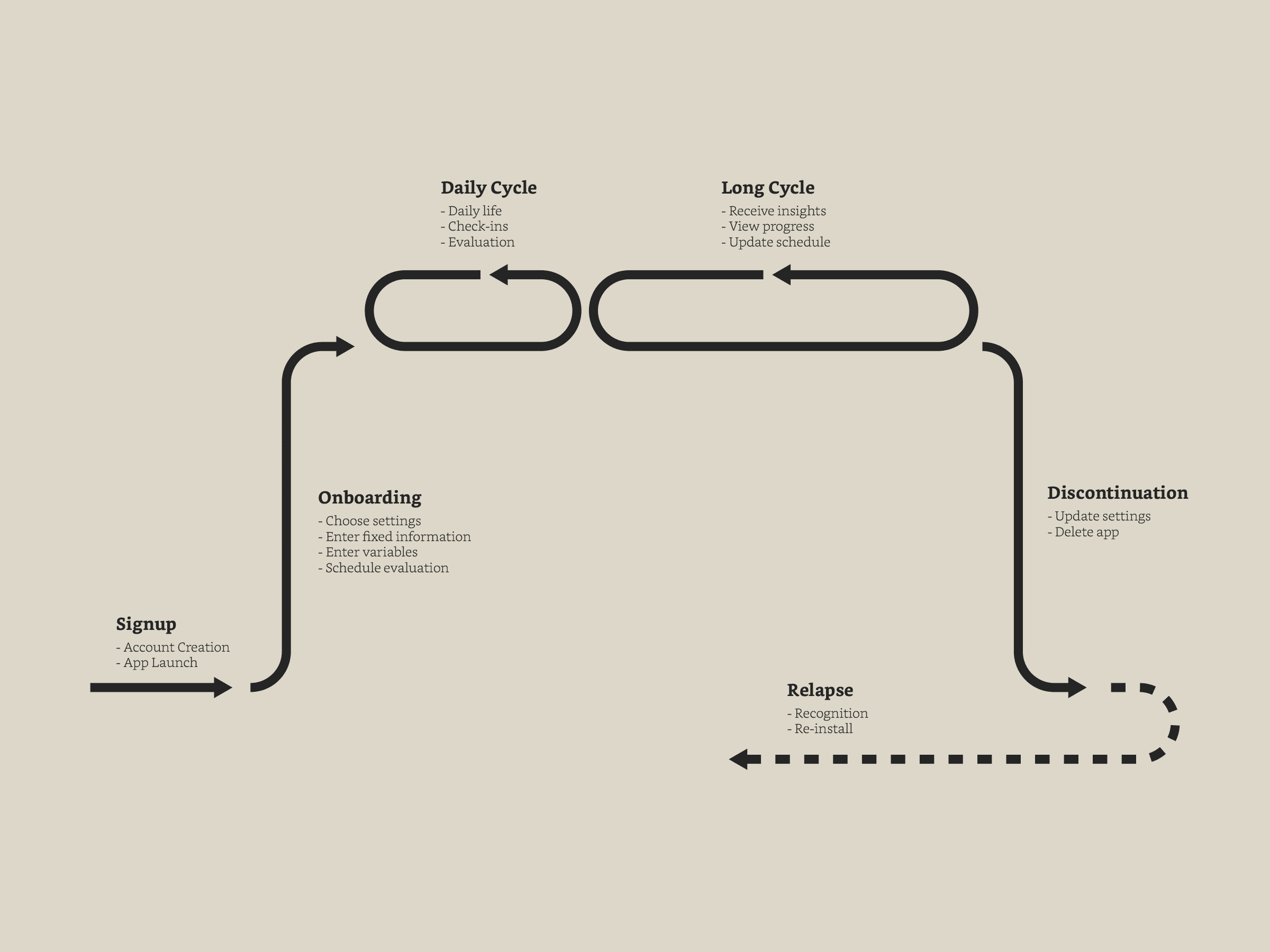 We began to conceptualize how this product would work. Research showed that people who used these vitamins would achieve their mental health improvement over the course of months or a year or so. We would need to track their health status daily over the course of this time. We also anticipated the ultimate discontinuation of the app, and it was also possible that some individuals may discontinue the supplements for some reason and end up relapsing.