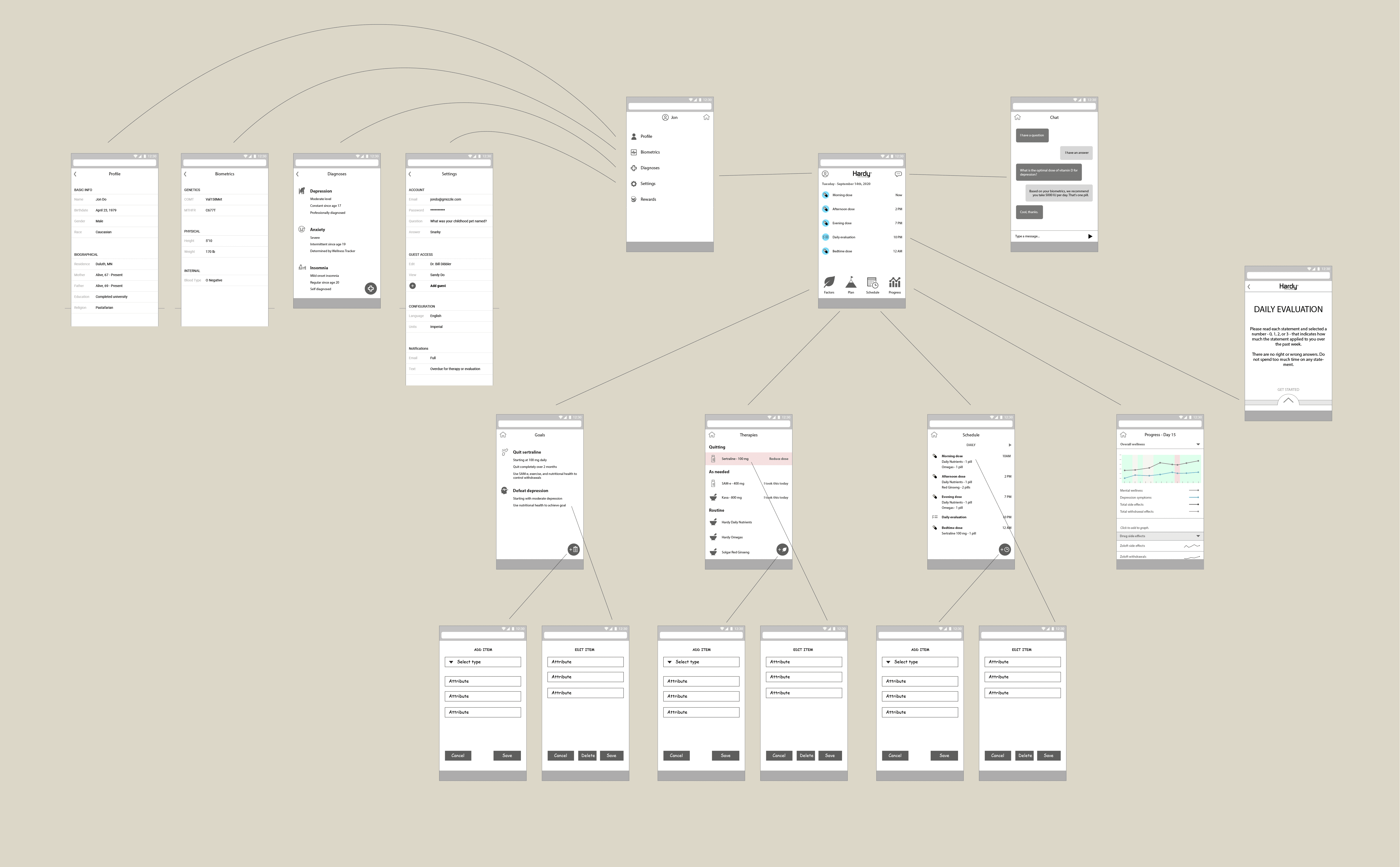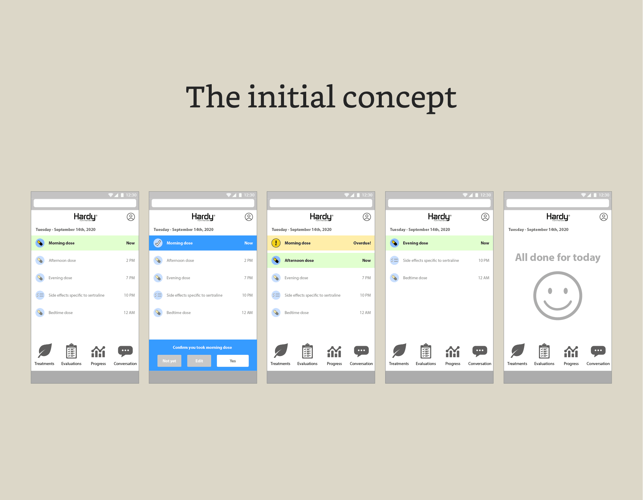 I generated a preliminary concept to demonstrate what an experience might look like. It collected vital statistics about a user, picked out a set of evaluations for them to take regularly, and then doubled as a pill dose tracker to ensure that people would always have a use for the app. The initial concept was a mobile web app to minimize development costs for the necessary rapid iteration.