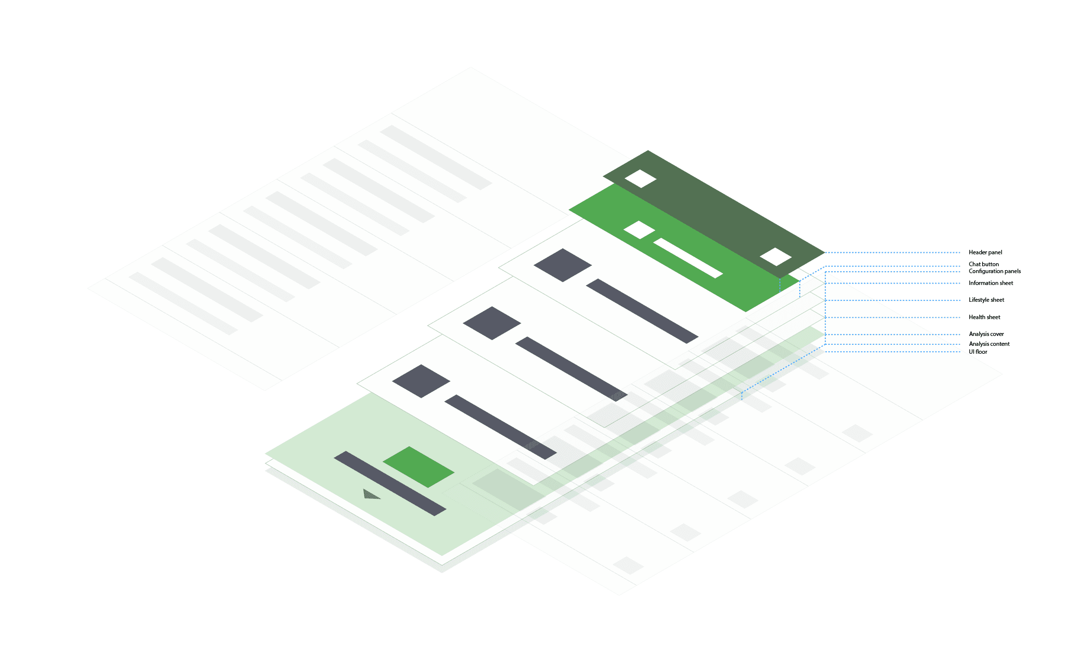 This was one of the earliest projects in which I used isometric projections to convey the spatial arrangement of an interface to both stakeholders and developers. The above image shows the modal screen that would be used for a number of functions like questionnaires and editors. The small amount of transparency enabled the user to see that they were still "located" in the page where they came from, and they were never far from home. This is just one example of the use of physical spatial orientation to reduce cognitive burden.