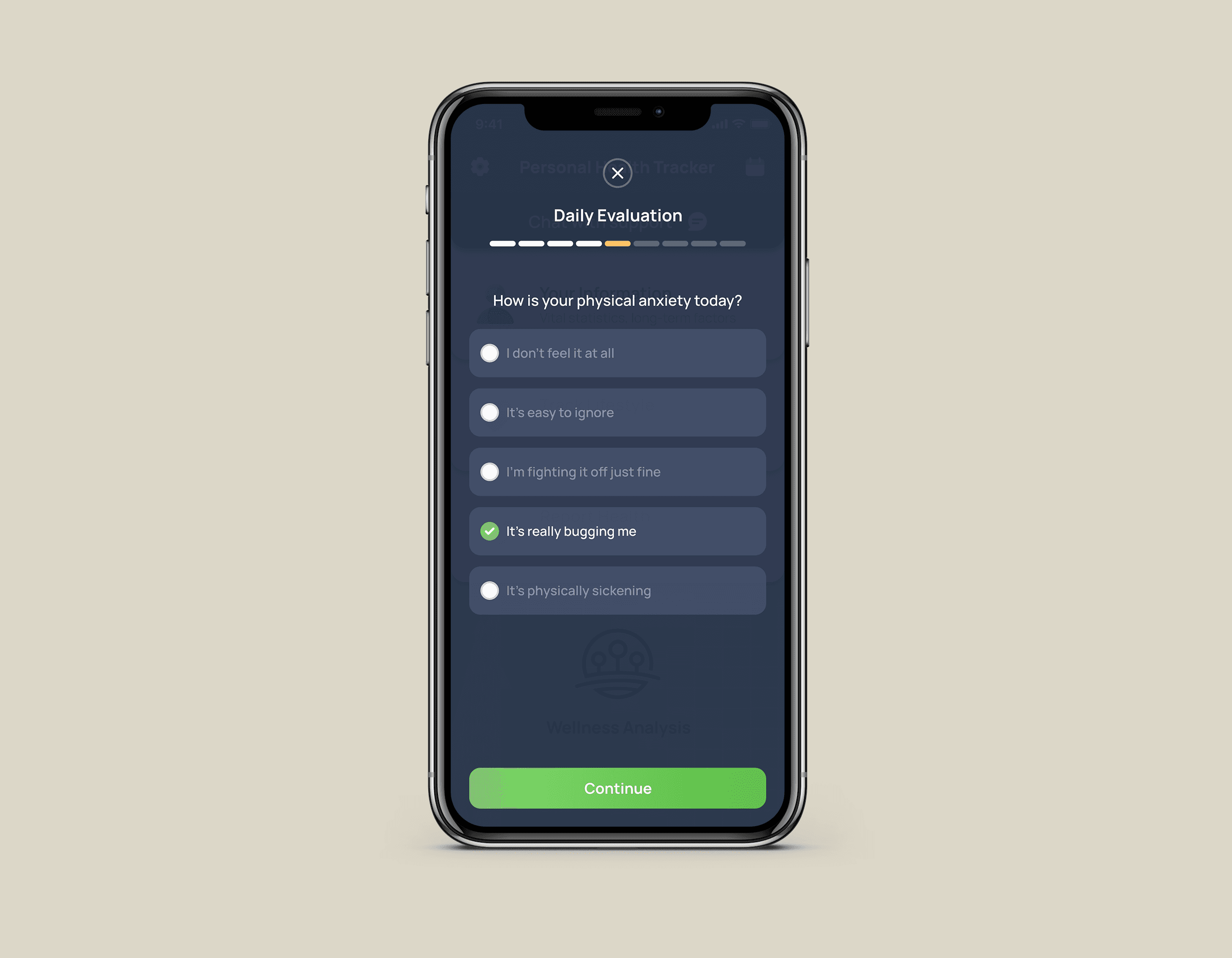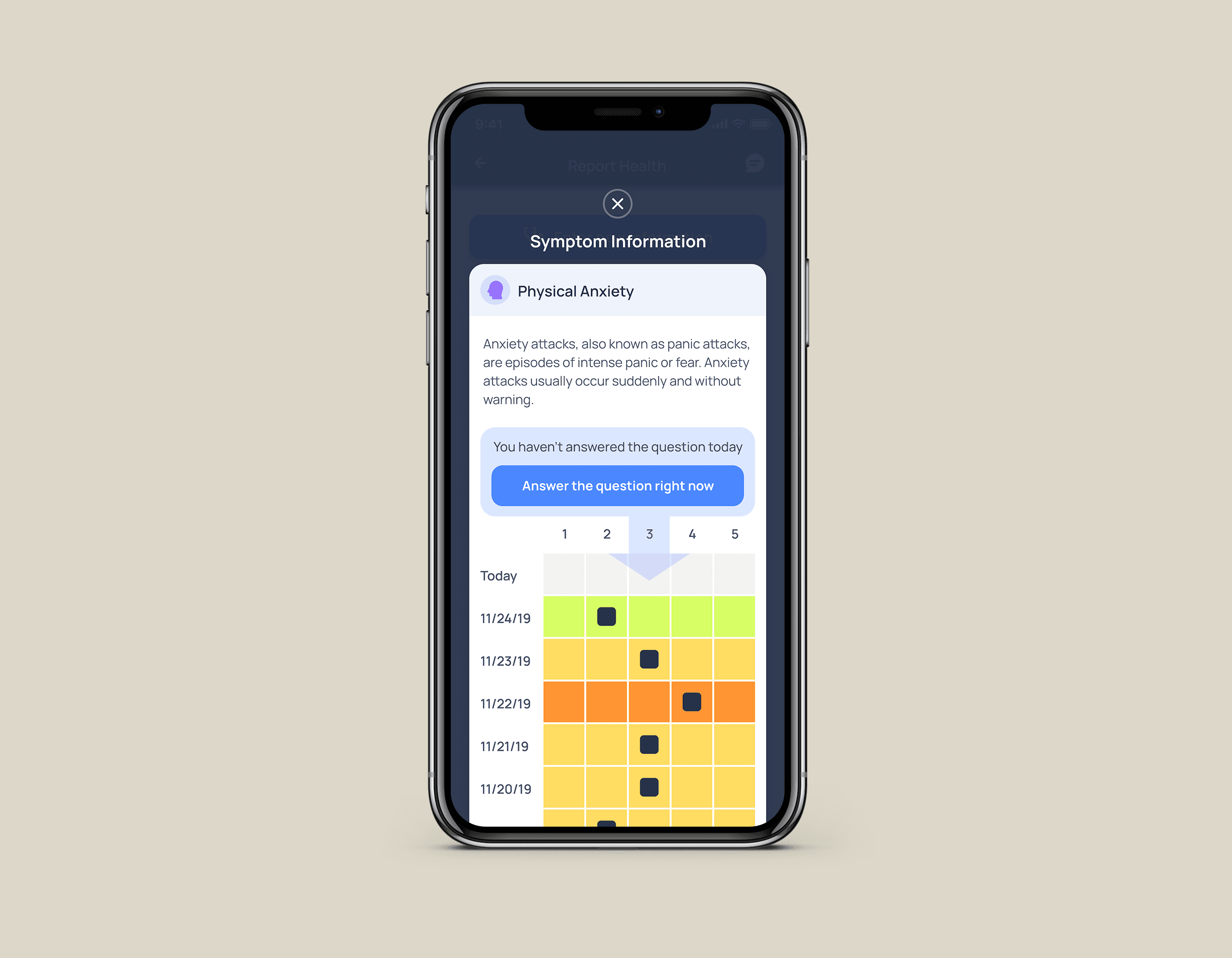 While users could fill out evaluations via text (which would be joint monitored by lightweight AI and the human staff), it is more convenient to click buttons on the native app. Using the semi-transparent modal, we made it clear the user's spatial relationship to the rest of the app. As always, reassurance and clarity were central, as it should be to any UX, but especially those catering to those with mental health issues.