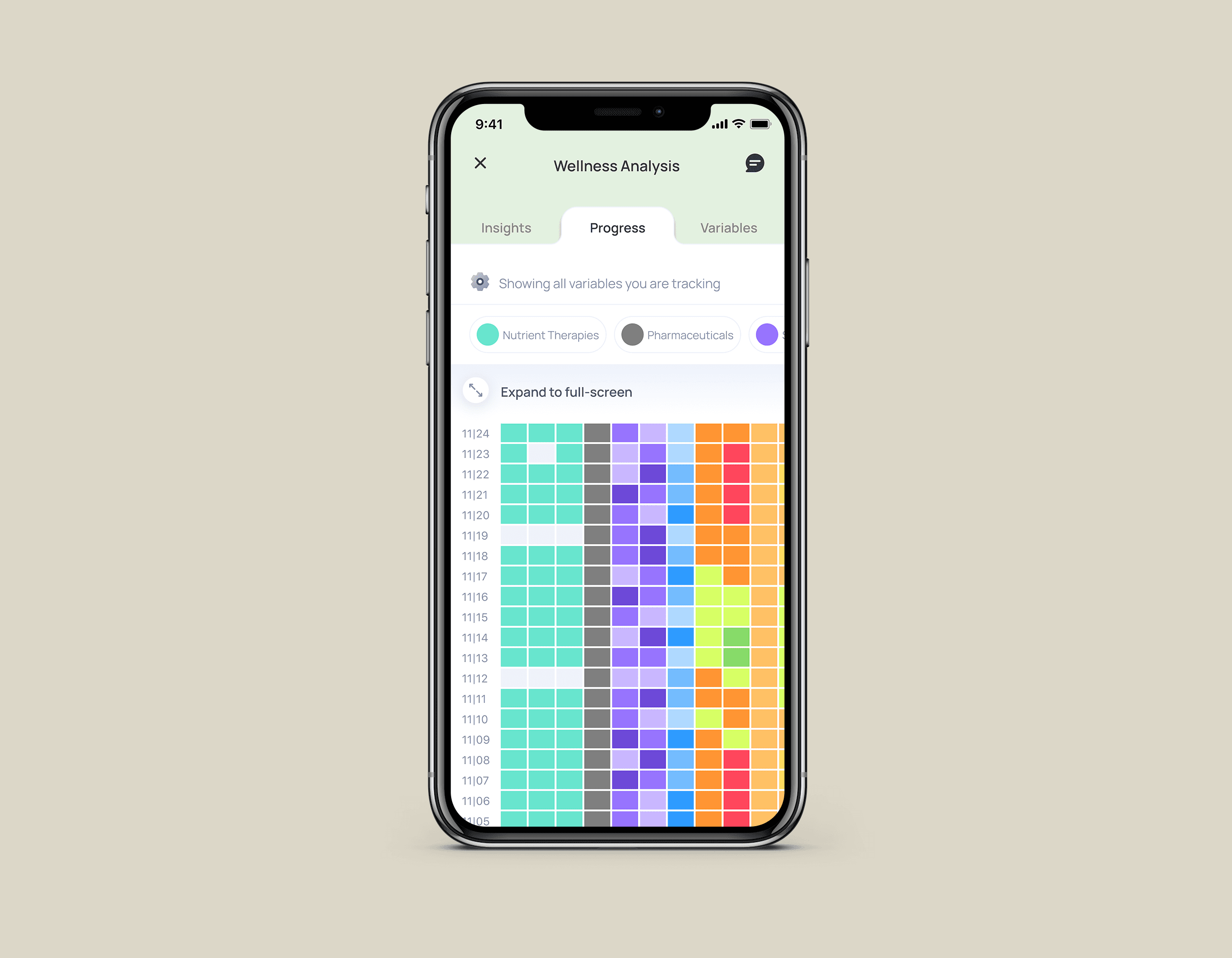 Tracking the user's progress was a challenge. Ultimately, we opted for a push system of simpler visualizations to show major improvements, or areas of concern, but to communicate the sense of complexity of the data being collected, (as well as to appeal to the love of details and stats in people with OCD, funny enough), we had this visualization that tracked the totality of a user's inputs and outputs over time. While a data literate person can read it, the main purpose is to provide a sense of the workings under the hood that would otherwise be abstract and invisible.