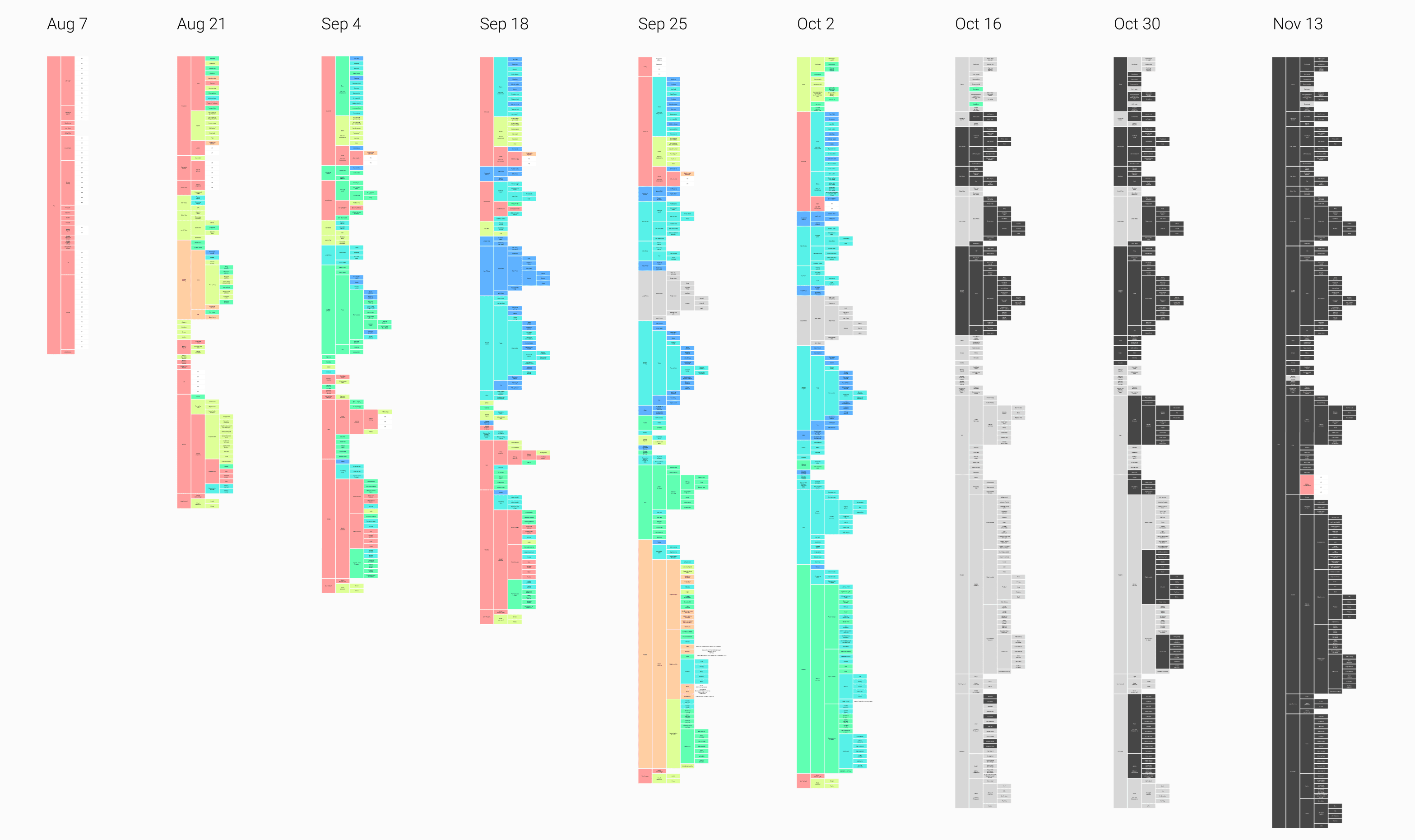 Each of those towers is a snapshot of a product over time. Each component of the product is color coded for its design or development status. With XenBuild, you can track any product metric in real time with no need to bug your team for a status report.